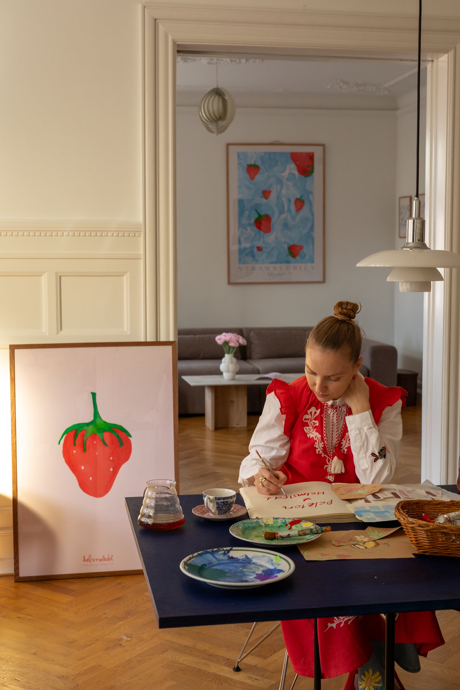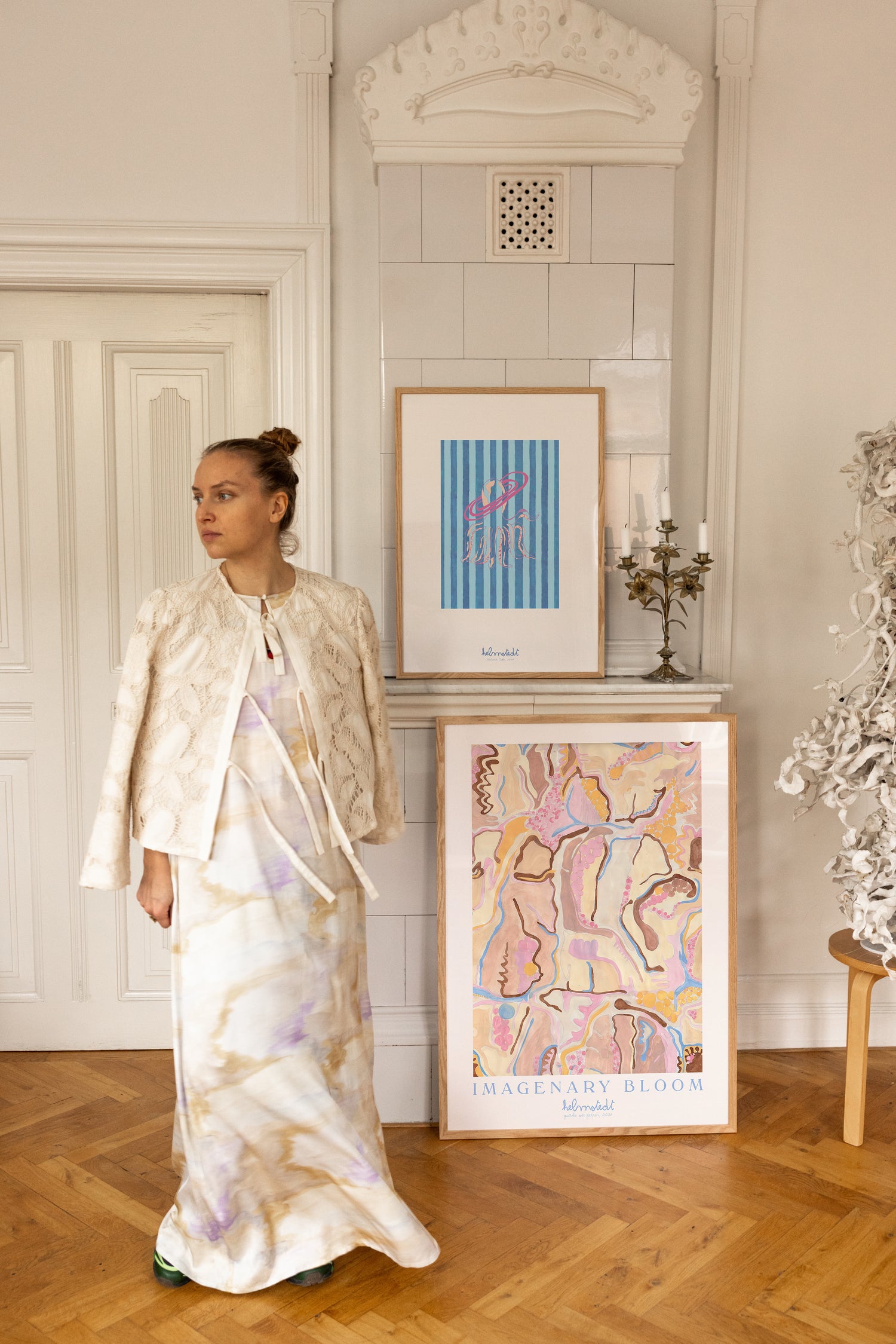 Emilie Helmstedt is the artist behind the 9 works. Her signature style and personality are clearly present in every single poster. The art is a living expression of her inner world – dreamy, colorful, and full of life. Every time Emilie sets out to create a new clothing collection, the process begins with a watercolor painting, which is transformed into a piece of art that eventually finds its way onto the clothing. A beautiful journey where her original artworks become part of the fashion world.