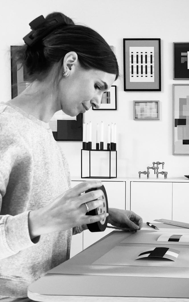 Louise's distinctive style with straight lines arose by accident when one day she began experimenting with painter's tape. It was the placement of the tape, not the paint, that created the most interesting patterns, and this intuitive working process quickly became a central part of her artistic expression. Louise also experiments with a range of materials such as paint, marker, fabric, and cardboard, which together create works with exciting three-dimensional depth. Her inspiration comes from the small patterns and structures she encounters in everyday life, from nature to everyday objects, which she transforms into art with a sense of calm and balance.