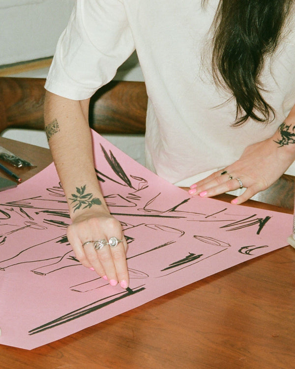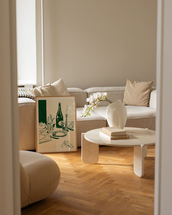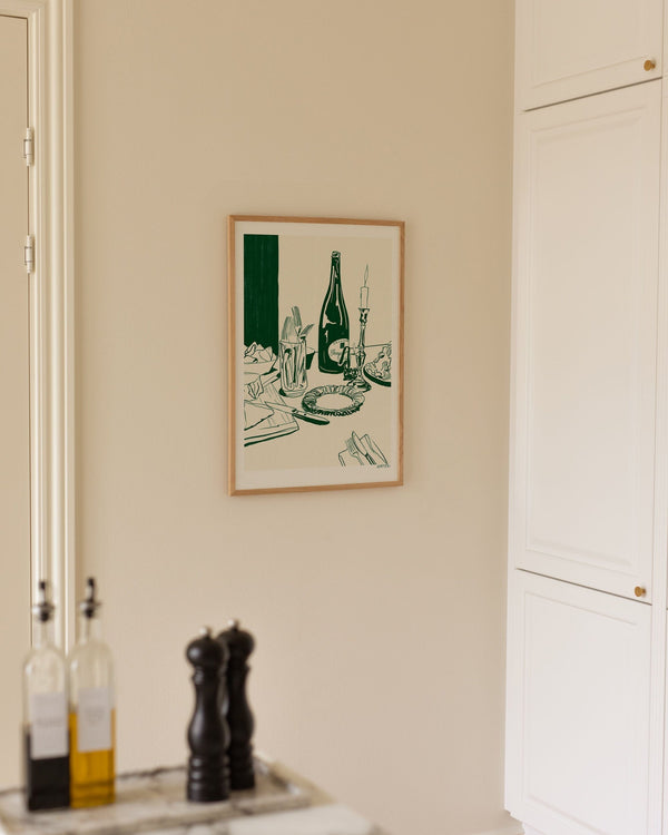 The art print: "Champagne and chips" by artist Kiki Makes is an illustrated poster curated for Peléton. This work was inspired by a dinner cooked by Kiki Makes most hedonist friend Jonah - champagne is always involved. The work captures a moment of dinner when a magnum of Champagne was paired with a plate of chips and homemade ham from their favourite butcher. This work was created digitally using minimal colour and line work.