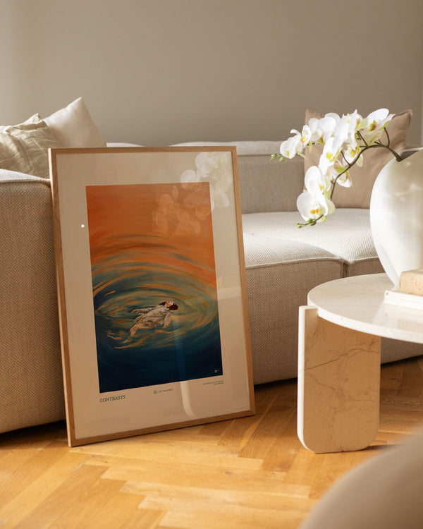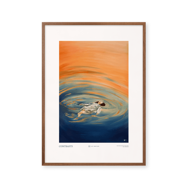 The art poster: "Contrasts" by artist Lot Winther is a painted poster made exclusively for Peléton. The art poster described in Lot Winther's own words: "I have always loved contrasts. In nature, in light and darkness, but most of all in us humans and our inner beings. Contrasts reflects my reconciliation with my own inner contrasts, the many extremes that make me the person I am. Chaos and rings in the water, but also peace and contemplation." The art poster is produced on quality paper, with long life, and detailed colour reproduction.