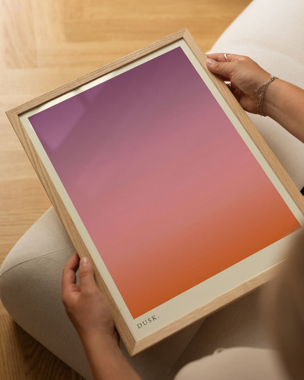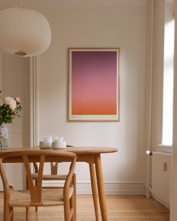The art poster: "Dusk" by artists Mie & Him is a graphic illustrated poster curated by Peléton. It has been important to them that the poster is open to free interpretation.