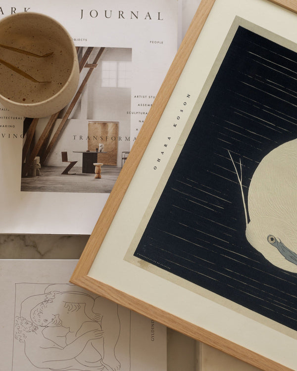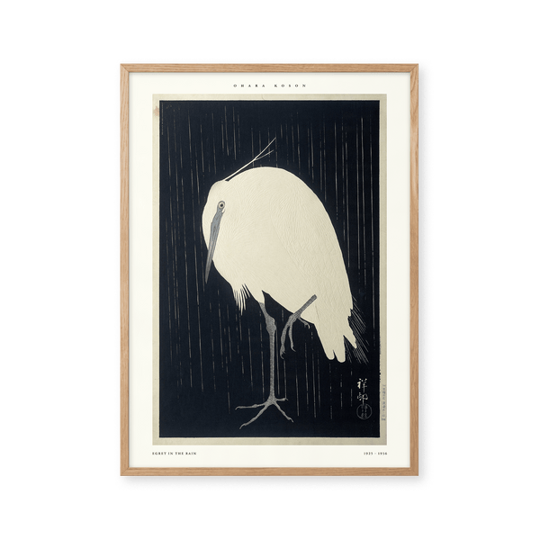 The art poster: "Egret in the rain" by artist Ohara Koson is a poster that Peléton has recreated from his iconic woodcuts. This poster series of Ohara Koson art posters is based on his famous woodcuts and paintings of birds and flowers. This poster is part of Peleton's vintage collection with museum layout. The art poster is produced on high quality paper with long life, high transparency and detailed color reproduction.