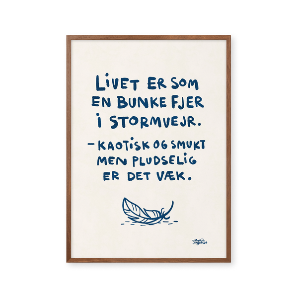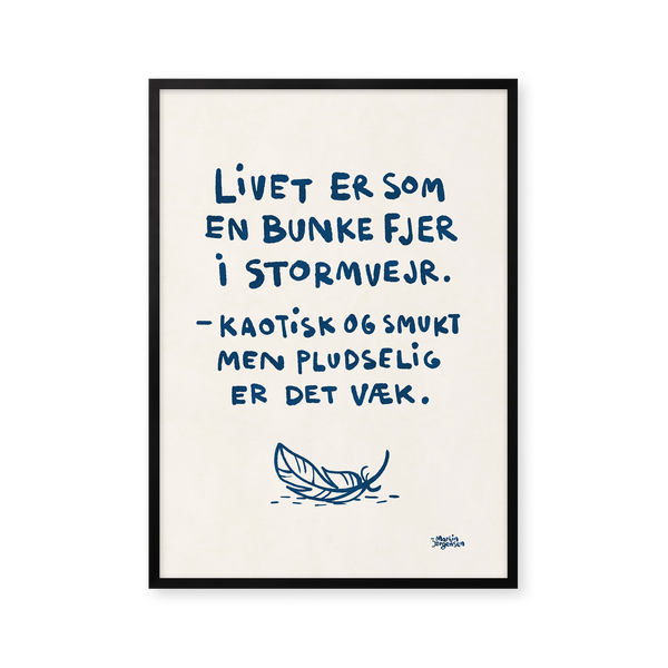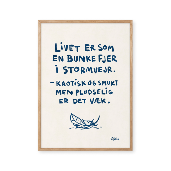 The poster shows the quote: Life is like a pile of feathers in a storm. - Chaotic and beautiful but suddenly it is gone.