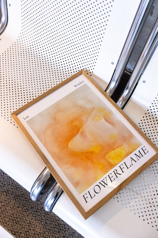 Kunstplakaten "Flowerflame" af Lot Winther er en malet plakat, kurateret særligt til Peléton. Motivet er en del af en ny kollektion af farveeksplosioner, inspireret af solens farveuniverser og varme stemninger.