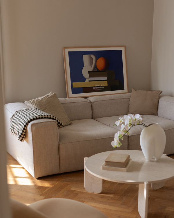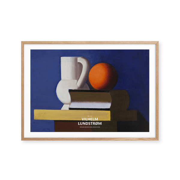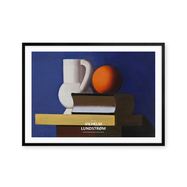 The art poster: 'Opstilling med hvid kande, appelsin og bog' by artist Vilhelm Lundstrøm is a painted poster recreated by Peléton. This poster series of Vilhelm Lundstrom's experimental and geometric art posters, is characterized by his colorful but simple style. This poster is part of Peléton's vintage collection with museum layout. The art poster is produced on quality paper, with long life, and detailed colour reproduction.