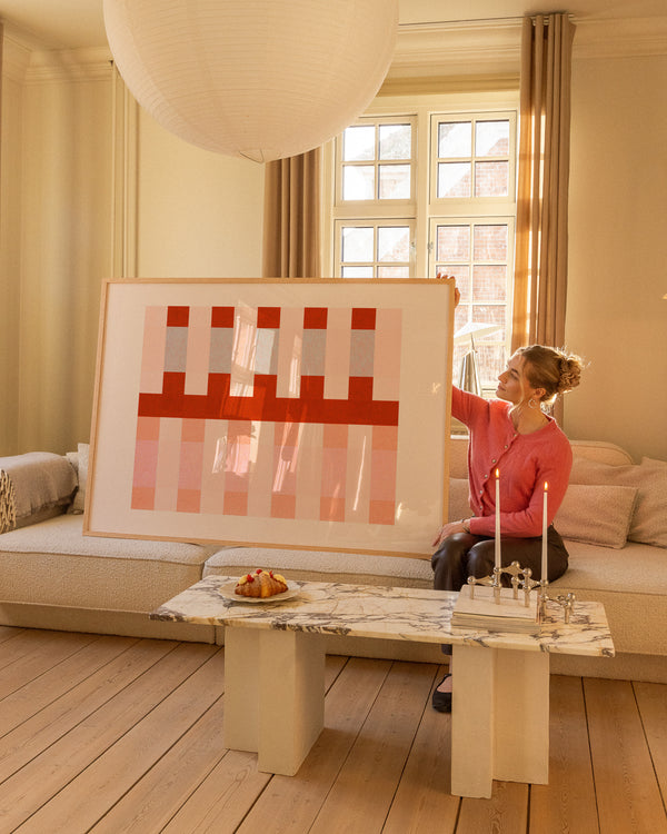 100 × 140 cm is our largest format and is known as the XL poster. It is an impressive size and is the ultimate statement on a large wall in any room it appears in. Its size makes it ideal for a large wall where it can stand alone or be combined with other furniture. You can also style it with a bench underneath, a lamp, or a chair beside it to create a harmonious balance in the interior.