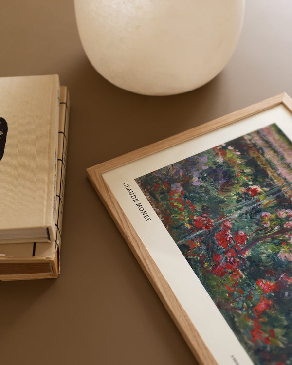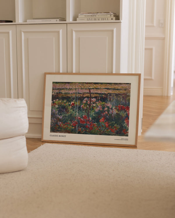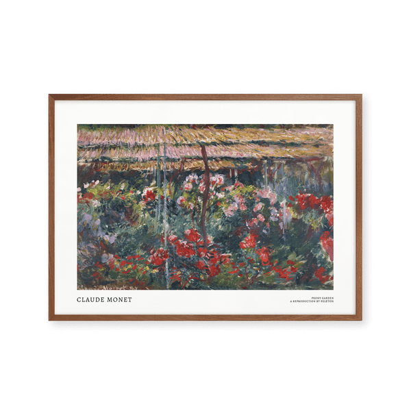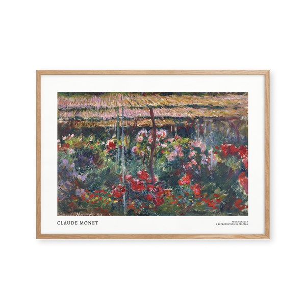 The art poster: "Peony Garden" by artist Claude Monet is a painted work of art recreated as a poster by Peléton. This poster collection of Claude Monet's colourful art posters with light colours, is characterised by his realistic and impressionistic style. This poster is part of Peléton's vintage collection with museum layout. The art poster is produced on quality paper, with long life, and detailed colour reproduction.