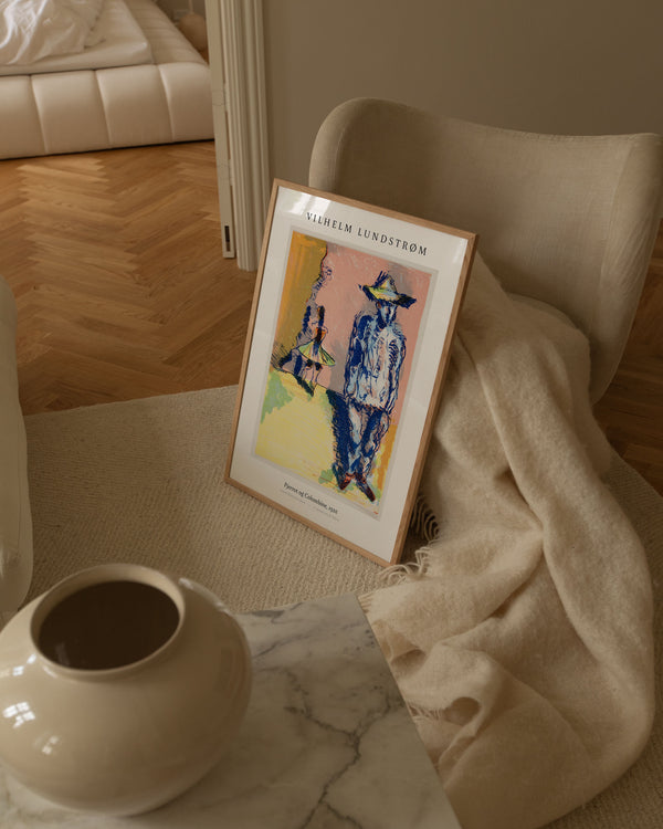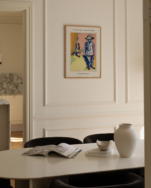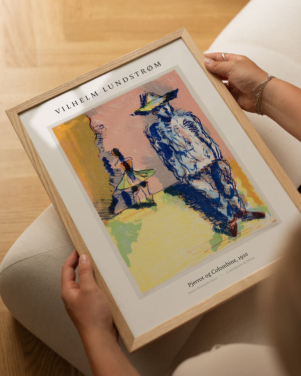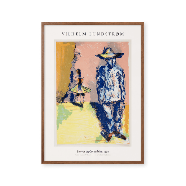 The art poster: "Pjerrot and Colombine" by artist Vilhelm Lundstrøm is a painted poster recreated by Peléton. This poster series of Vilhelm Lundstrom's experimental and geometric art posters, is characterized by his colorful but simple style. This poster is part of Peléton's vintage collection with museum layout. The art poster is produced on quality paper, with long life, and detailed colour reproduction.