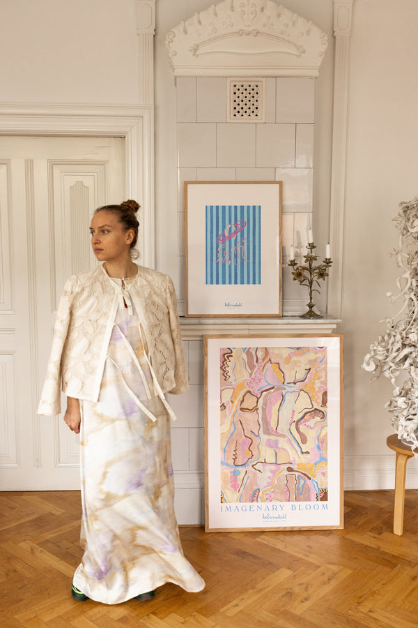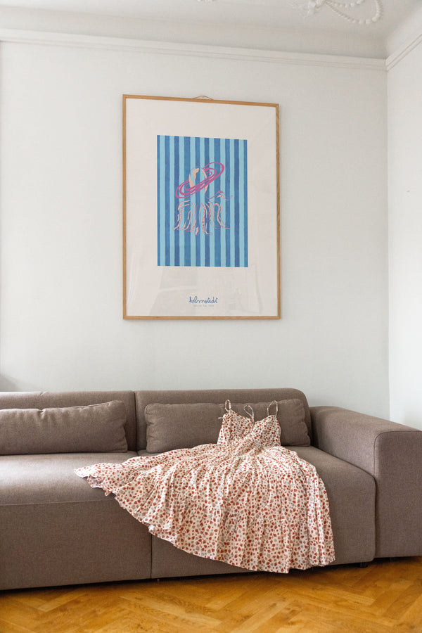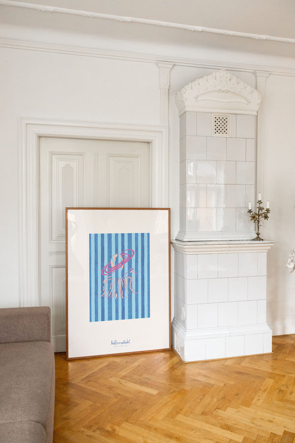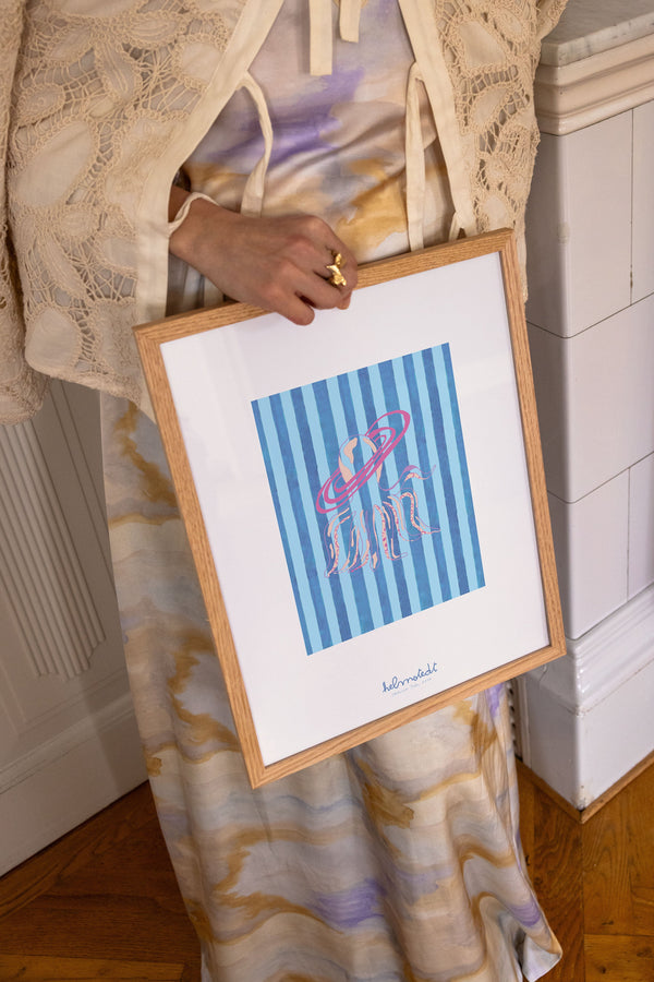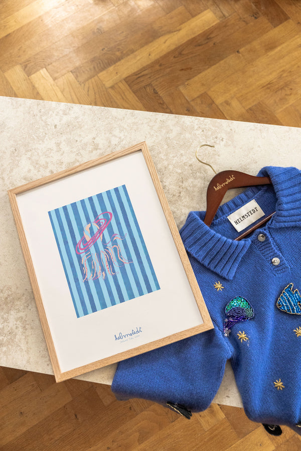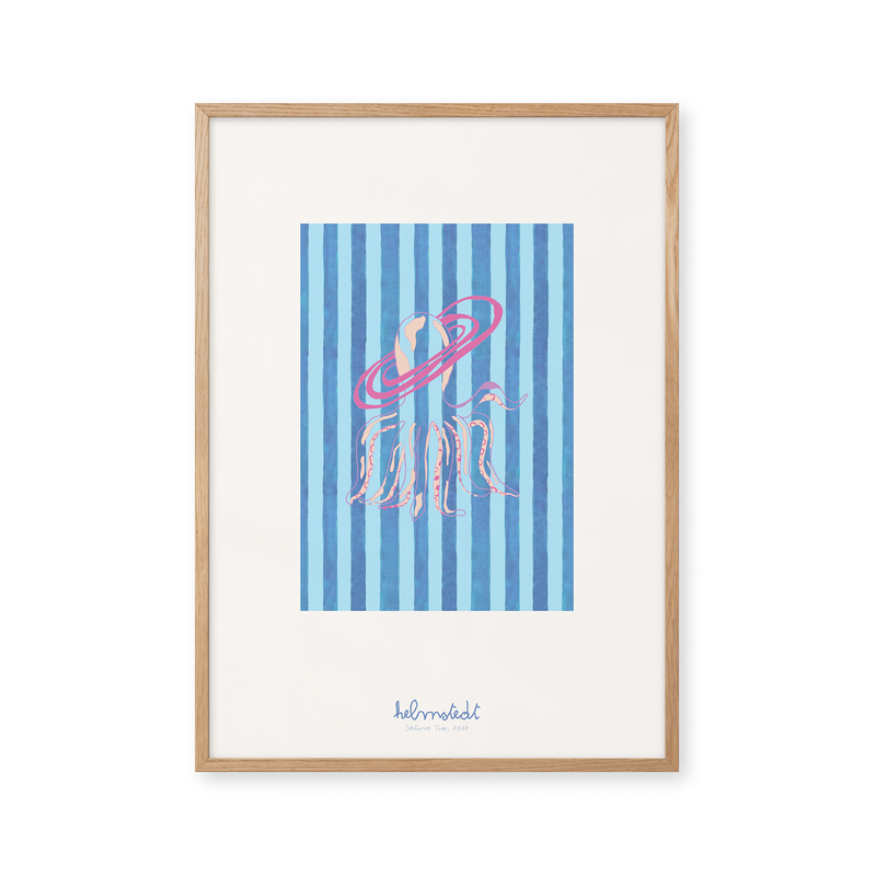 Kunstplakaten "Saturn Tide – Blue" er malet af Emilie Helmstedt og indgår i den eksklusive kunstserie Peléton x Helmstedt, hvor interiør, design og fashion smelter sammen i et fælles univers. Et helt unikt samarbejde, som kun kan opleves her.