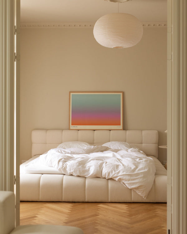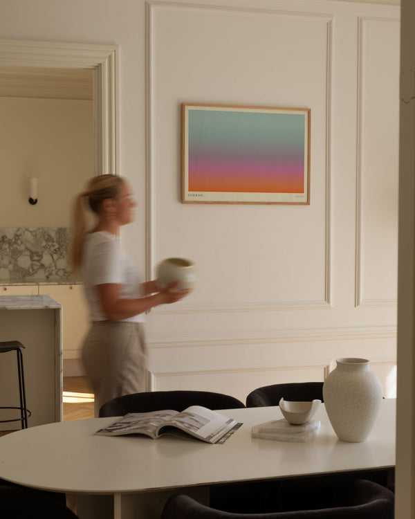 100 × 140 cm is our largest format and is known as the XL poster. It is an impressive size and is the ultimate statement on a large wall in any room it appears in. Its size makes it ideal for a large wall where it can stand alone or be combined with other furniture. You can also style it with a bench underneath, a lamp, or a chair beside it to create a harmonious balance in the interior.