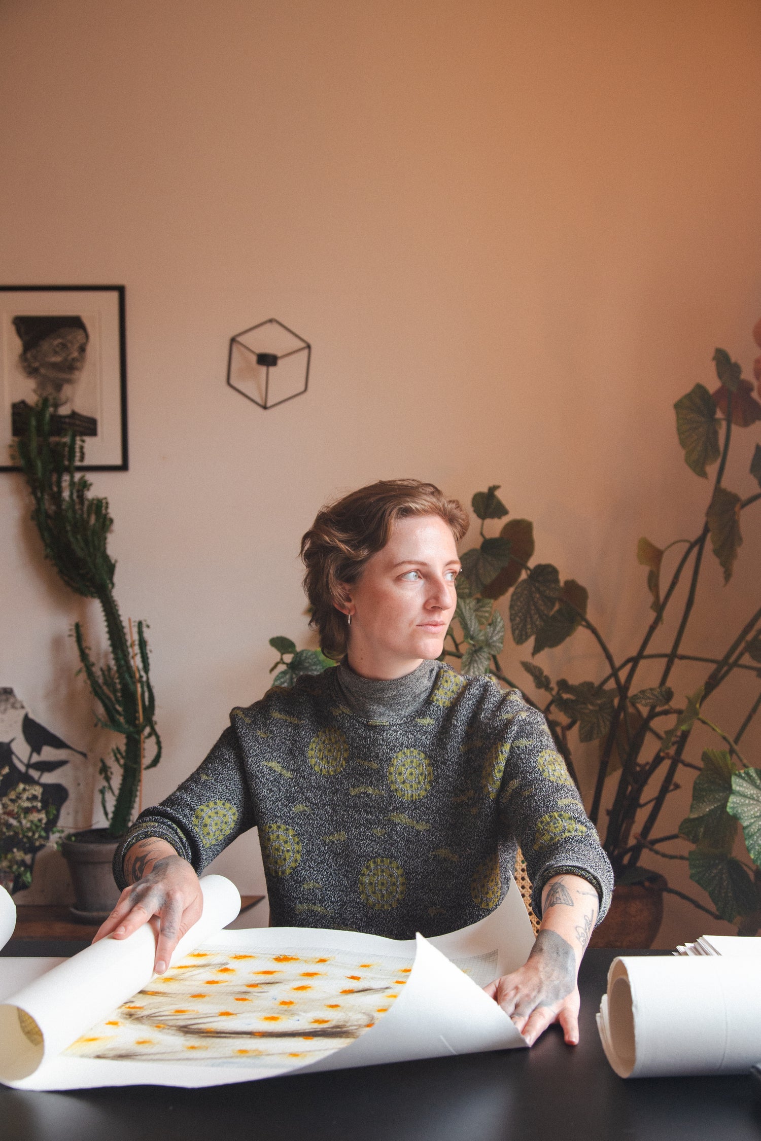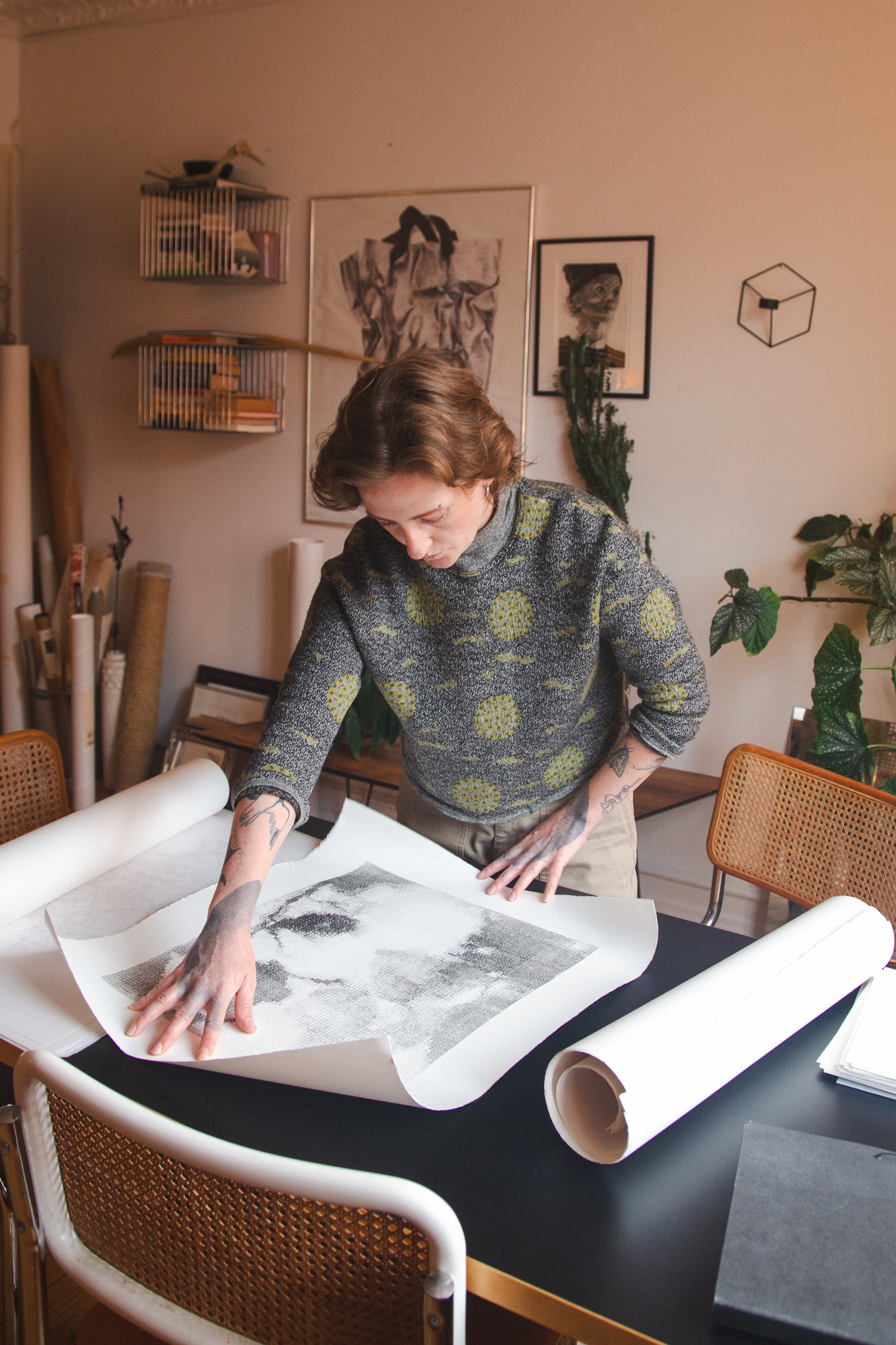 I serien af monotypiske tryk tager Julie afsæt i det kvadrerede matematikhæfte. Her fungerer griddet som et regelsæt for systematik og gentagelse, men gentagelserne bruges til at åbne et mere frit, drømmende rum. Det stringente mønster, ætset i kobberpladen, står i kontrast til den påførte tryksværtes dybe og bløde farver, hvilket skaber en spænding mellem det stramme og det levende.
