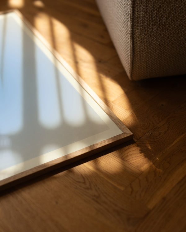 Rammerne i eg er lavet af massivt egetræ. Den mørke variant er bejdset for at opnå en dyb, varm tone, mens den sorte ramme er fremstillet af sortmalet fyrretræ med samme elegante profil.