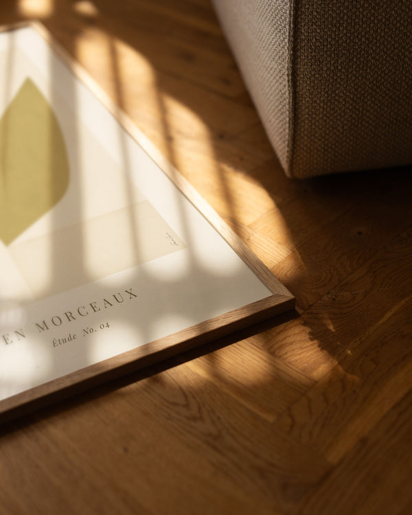 Rammerne i eg er lavet af massivt egetræ. Den mørke variant er bejdset for at opnå en dyb, varm tone, mens den sorte ramme er fremstillet af sortmalet fyrretræ med samme elegante profil.