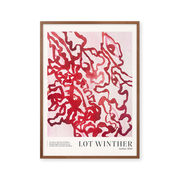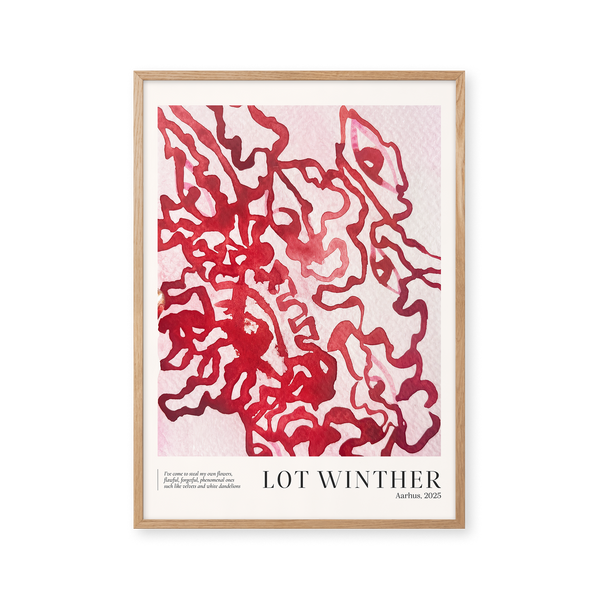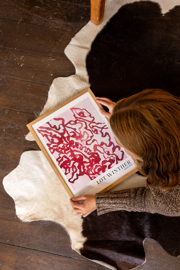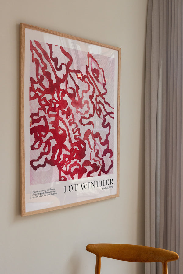 Kunstplakaten "Flower Thief" af Lot Winther er en malet plakat, kurateret særligt til Peléton. Motivet er en del af en ny kollektion af farveeksplosioner, inspireret af solens farveuniverser og varme stemninger.