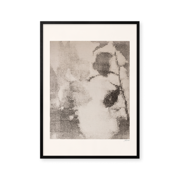 Kunstplakaten "Monotype – Faded Black" er en del af Julie Barnes Dahls eksklusive monotopi-kollektion for Peléton. Kunstformen monotopi tager afsæt i det kvadrerede matematikhæfte, hvor griddet skaber systematik og gentagelse, men åbner også op for et frit, drømmende rum. Det stringente mønster står i modsætning til de dybe, bløde farver fra tryksværten, som skaber en spænding mellem det stramme og det levende. For hende har det været vigtigt, at plakaten står til fri fortolkning.