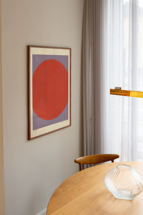 Kunstplakaten: “No. 1, Porpora” er skabt af kunstneren Das Rotes Rabbit og er en del af en kunstserie eksklusivt lavet til Peléton. Serien har karakter og personlighed og fungerer perfekt som et statement piece eller i samspil med de øvrige værker i serien. Farverne og den minimalistiske stil smelter sammen og skaber et harmonisk udtryk, der tilføjer dybde og elegance til ethvert rum.