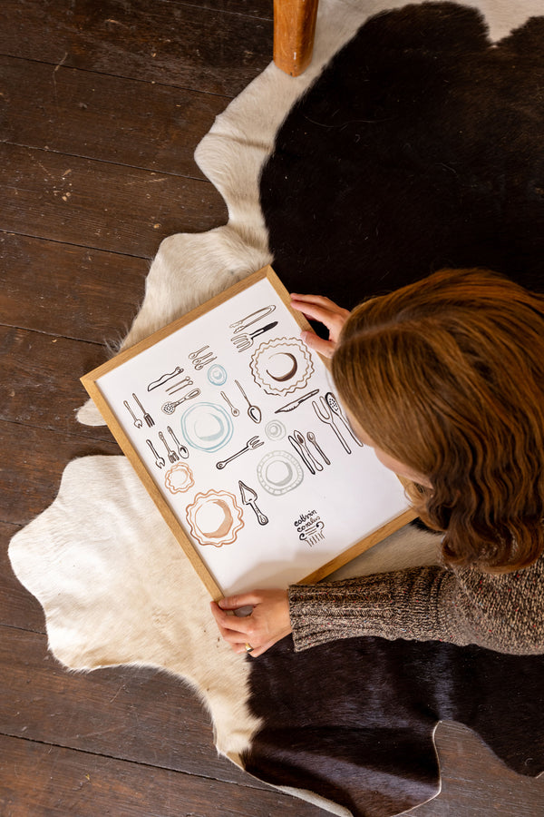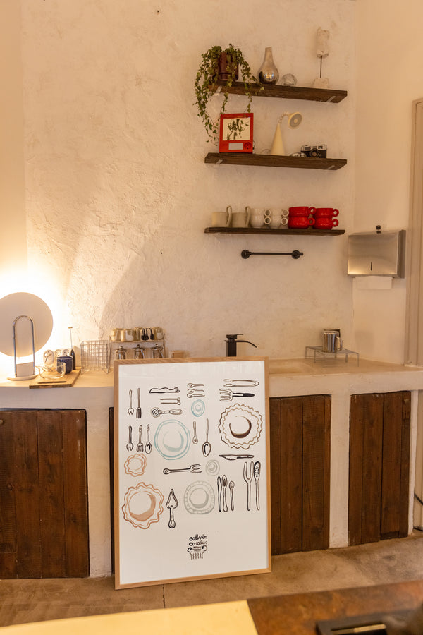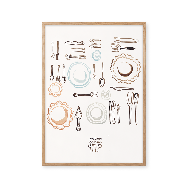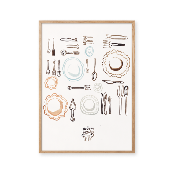 Cathrin Coralus kunstplakat "Plates & Cutlery" er en del af en farverig kollektion skabt eksklusivt til Peléton. Motiverne hylder legende kompositioner, stærke farver og Cathrins finurlige billedunivers, hvor sentimentale temaer og en kunstnerisk lethed går hånd i hånd.