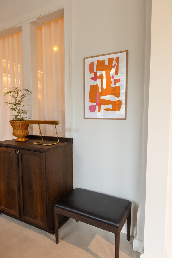 Karla Hymans kunstplakat "Sunset Stroke" er en del af en farverig kollektion udviklet specielt til Peléton, og som hylder legende kompositioner og stærke farvevalg. Hendes værker er præget af en enkel og abstrakt stil, hvor form og farver spiller tæt sammen.